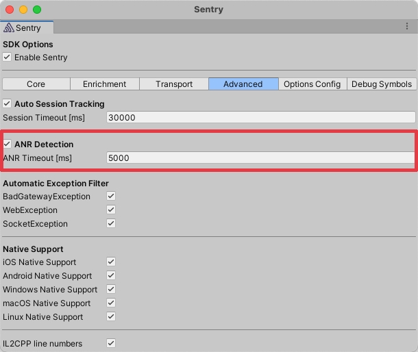 ANR detection is enabled by default in Sentry, but you can opt-out through the editor window by going to Tools -> Sentry -> Advanced -> ANR Detection. You can also set the ANR timeout there.