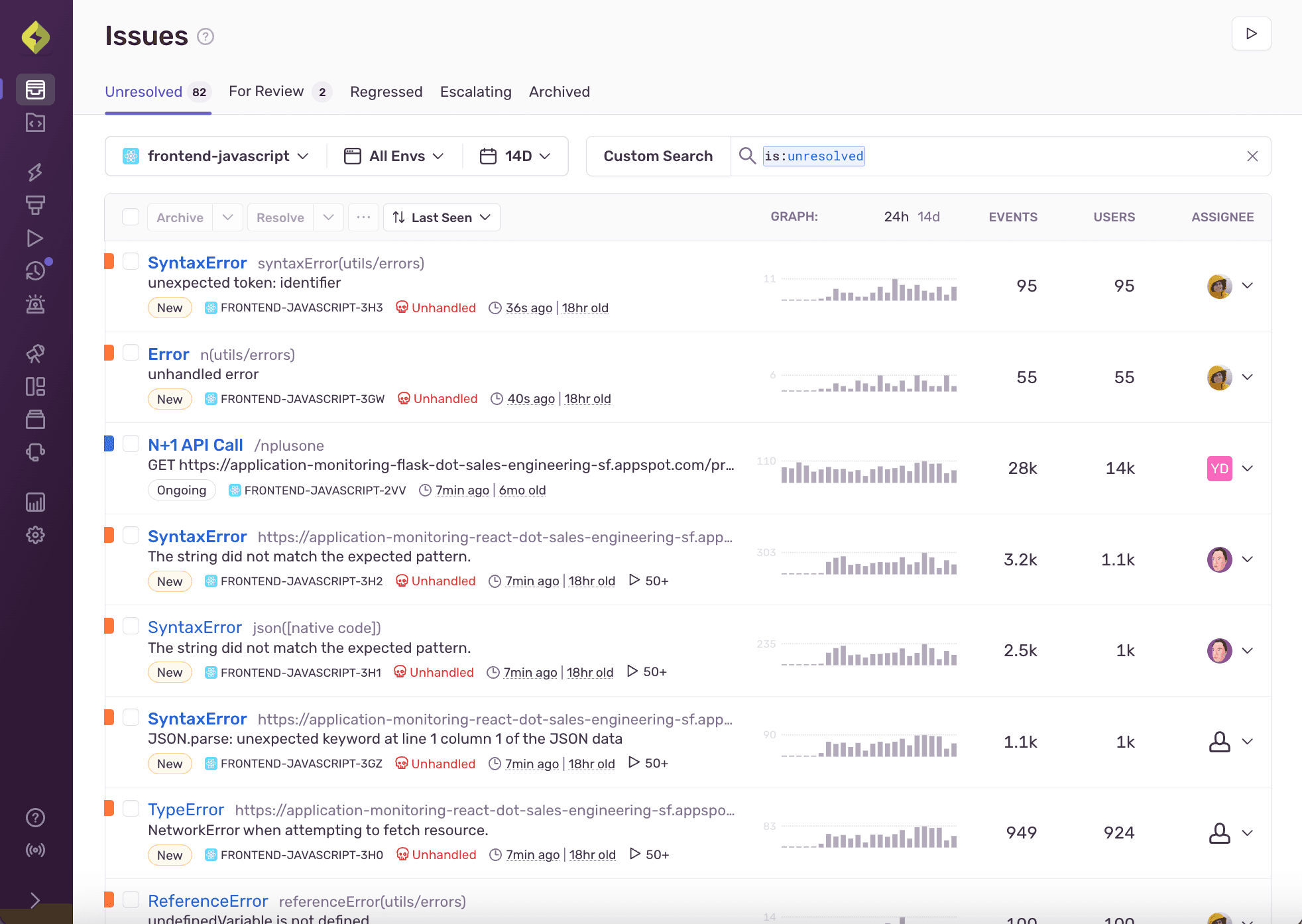 - Events: Issues are sorted by total event volume.